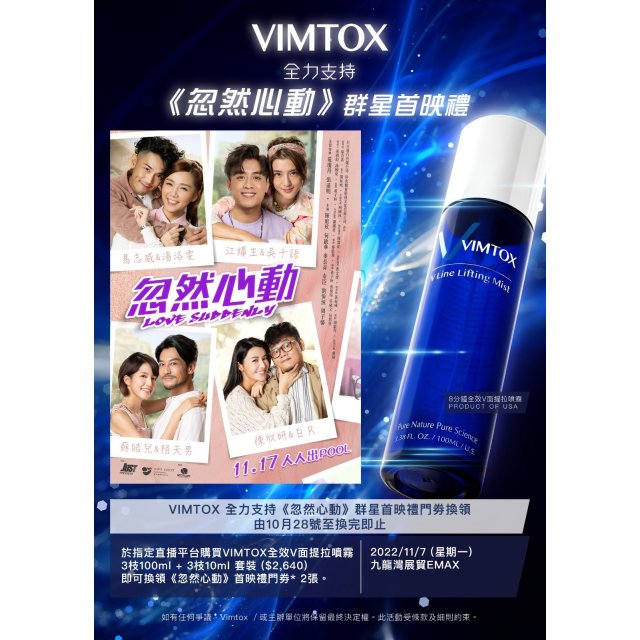 Vimtox 全效V面提拉噴霧 100ml 3枝 set +10ml x3 枝套裝 +《忽然心動》首映禮門卷 2張 (門票數量有限,先到先得! 換完即止。)